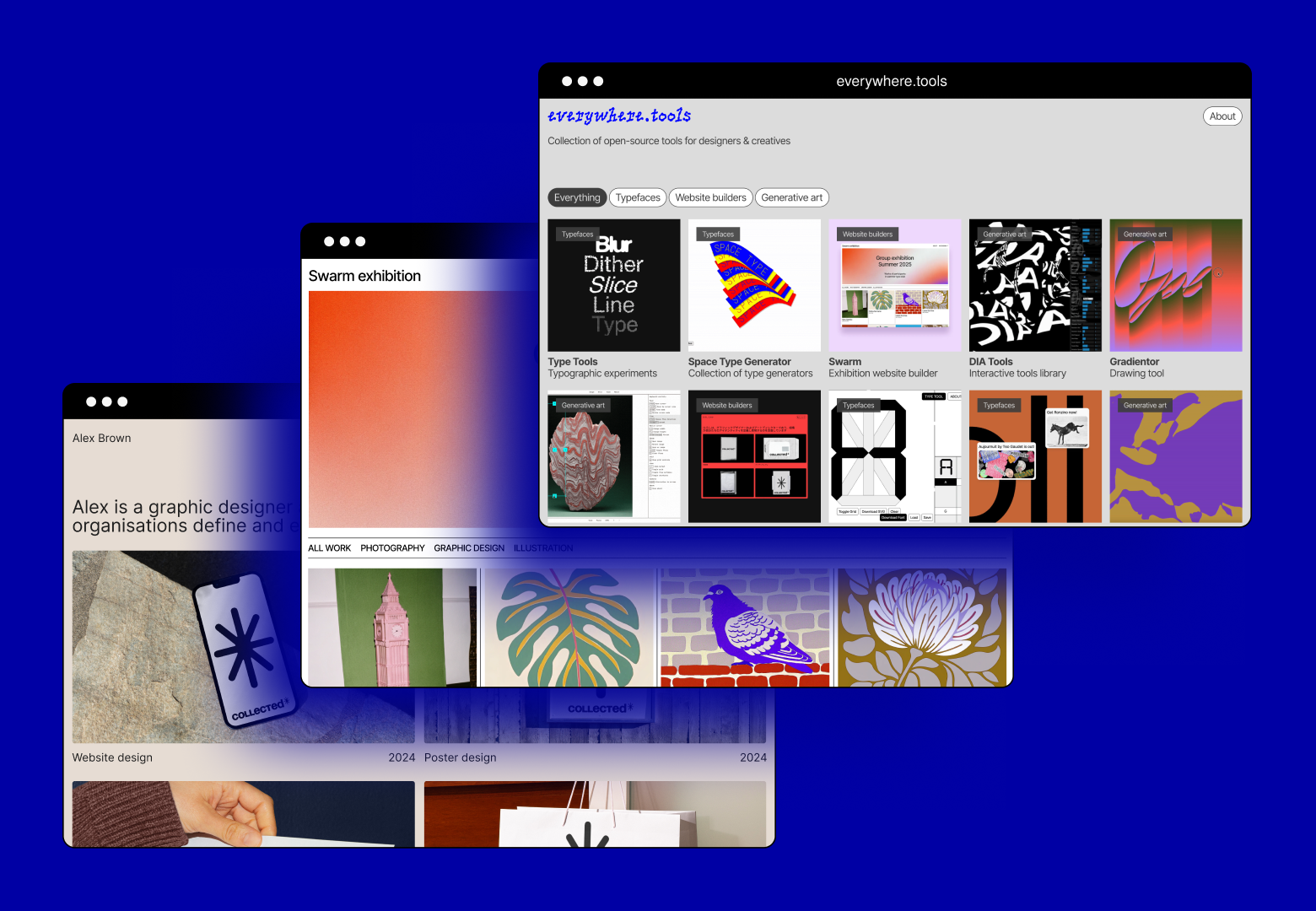 While working on Collected and Swarm, I started thinking not just about the tools themselves but their ecosystem, how people discover, share, and get inspired to create their own. I noticed that finding open-source projects for designers was harder than it should be. I wanted to gather them in one place so they’d be easier to locate, use, and spread.