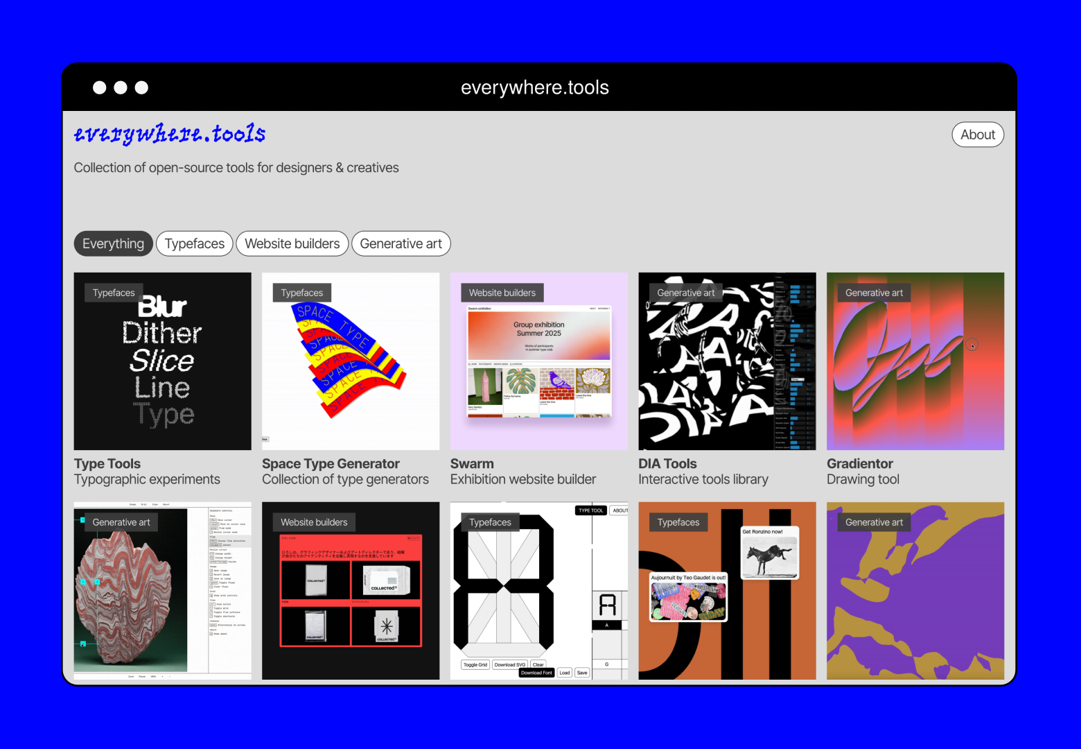 That’s how Everywhere.tools was born, it's a living collection of open-source design resources, from web apps to generative services and open font libraries. My goal wasn’t simply to list useful links but to champion a sharing culture: to show that designer-centric open-source projects exist, are convenient to use, and deserve to be shared. I hope the platform will help these initiatives grow and inspire others to start their own.